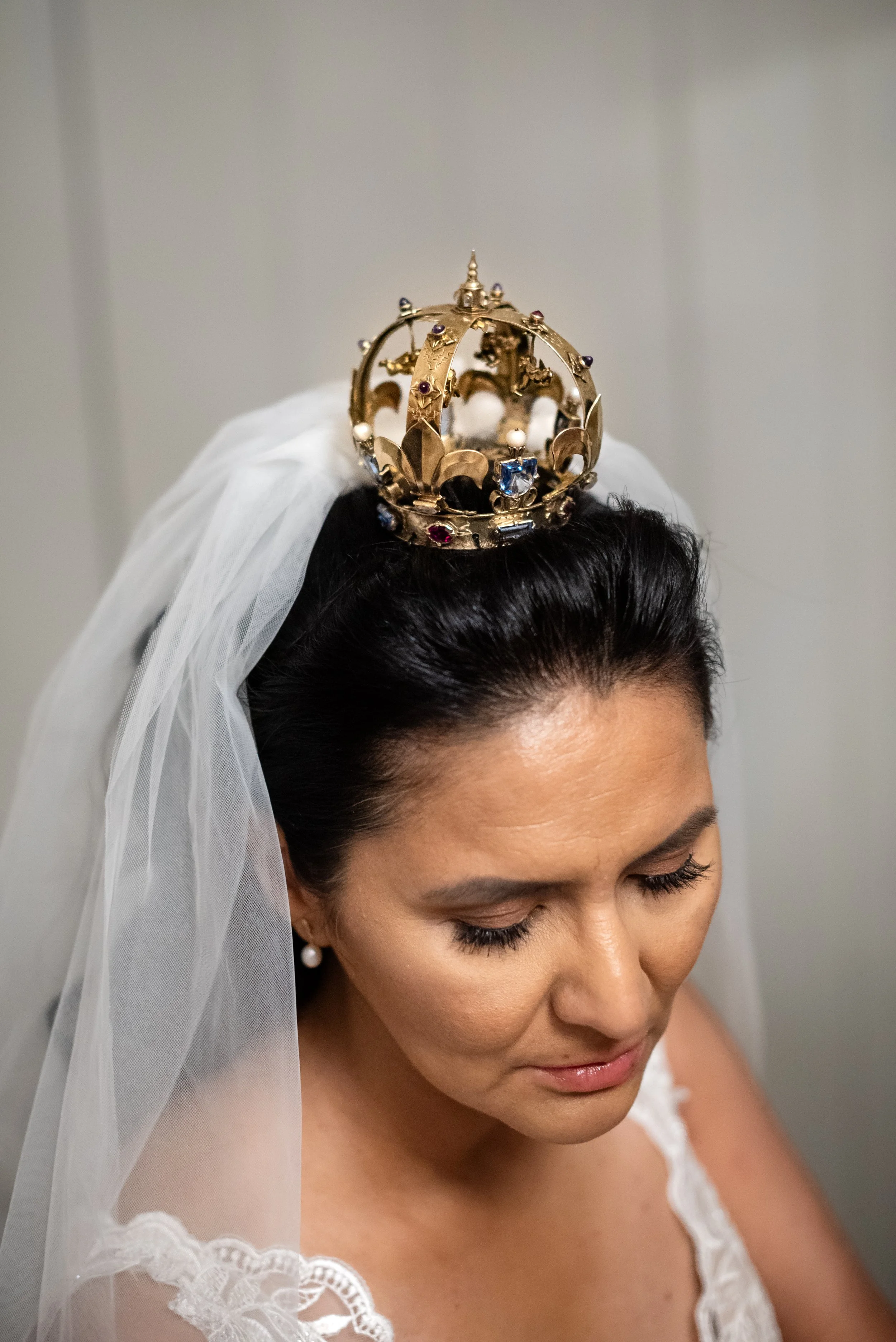 Ett extra inslag som många brudpar väljer är möjligheten att låna en brudkrona från Bromma församling till vigseln. Församlingen äger två brudkronor som får användas vid vigsel i sina kyrkor, inklusive Bromma kyrka. Att en av kronorna (den på bilden här ovan) dessutom liknar själva interiören av kyrkan med de små änglarna i “taket” (som syns på bilden här nedan) gör kronan extra speciell och i min mening, väldigt söt.