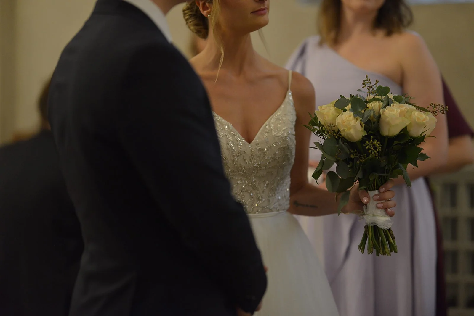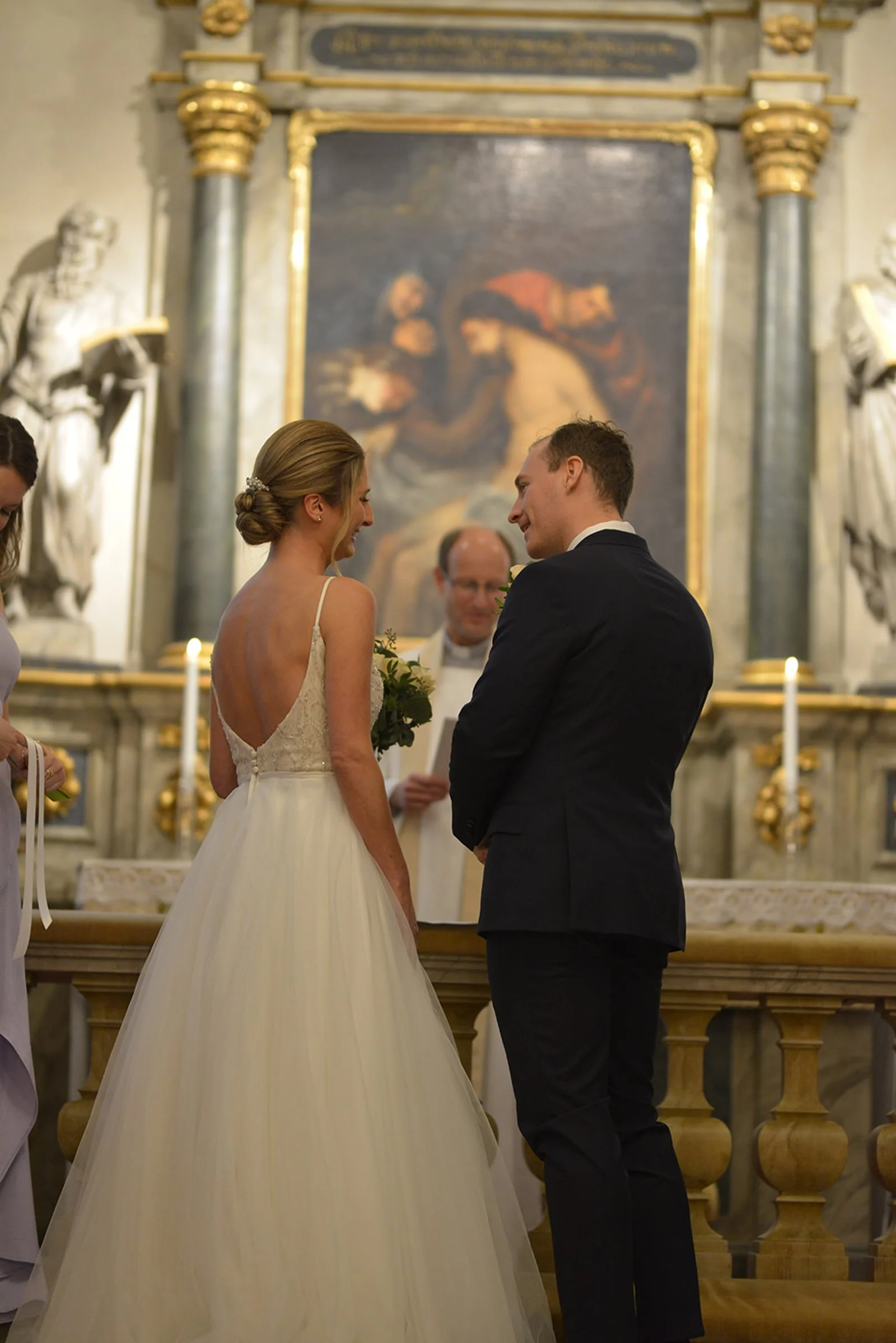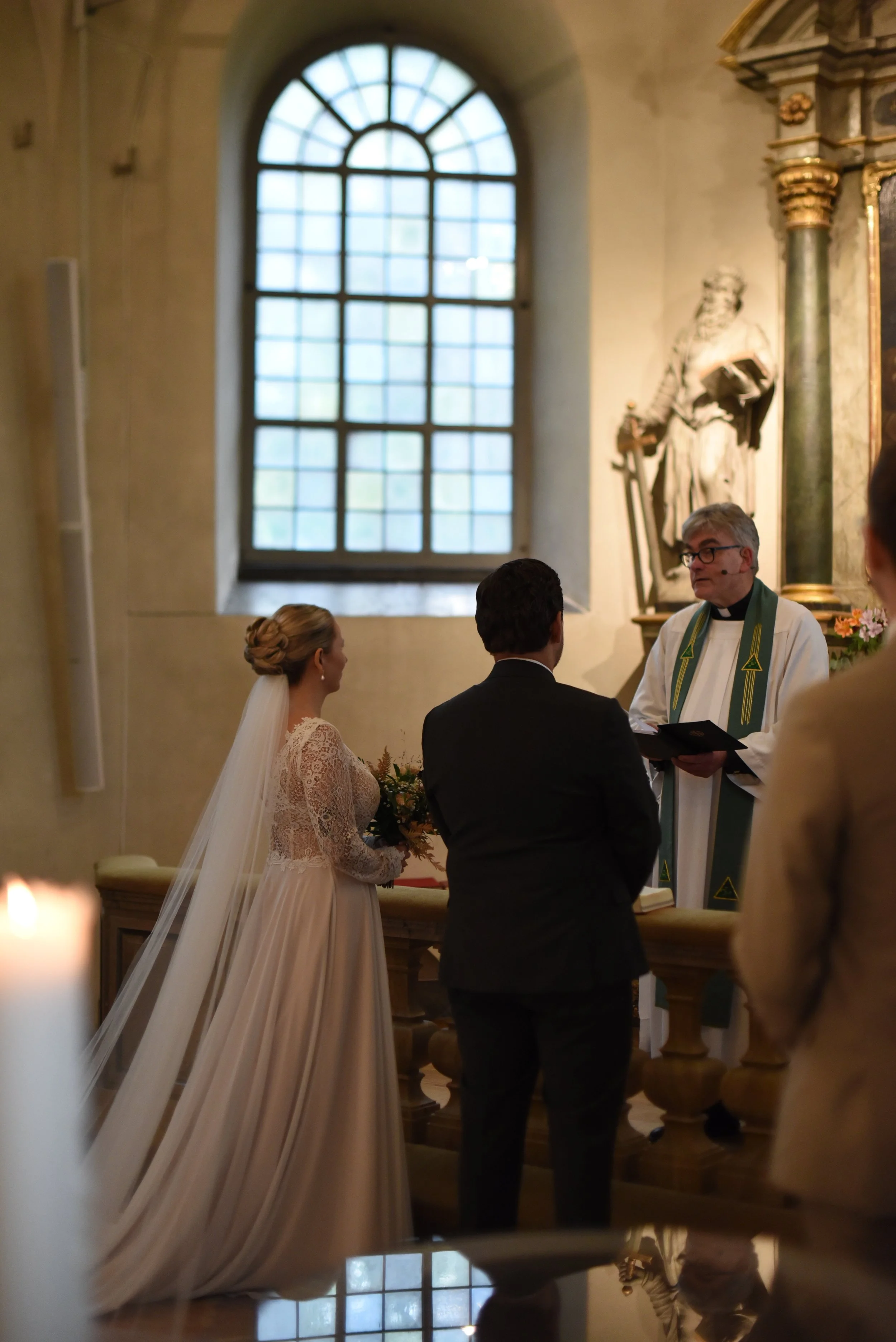 Inne i Bromma kyrka är ljuset mjukt och skapar en harmonisk atmosfär för stämningsfulla bröllopsbilder under vigseln. Vigselaltaret har stora ljusa fönster med fantastiskt ljusinsläpp.